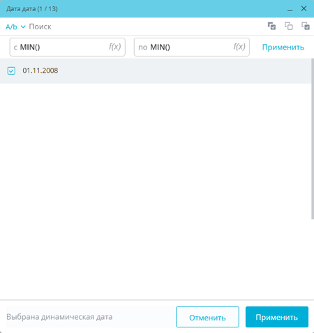 Для настройки такой подстановки используется кнопка в правой части полей «с» и «по». По нажатию на кнопку появляется выпадающее меню с опциями «Не выбрано», «MIN()» и «MAX()»: