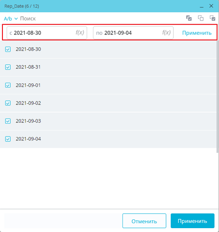 По клику кнопки Применить для указанного диапазона значений окно настройки отображает только значения, попадающие в диапазон, и автоматически проставляются флажки только для выбранного диапазона. В результате фильтром будут отобраны только значения из диапазона. При нажатии на кнопку значение диапазона в поле сбрасывается, фильтрация отменяется до выбора нового значения.