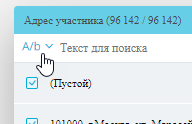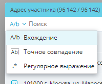 По умолчанию поиск выполняется по вхождению введенных символов. Вы можете выбрать один из трех типов поиска. Для этого кликните левой кнопкой мыши по иконке перед строкой поиска: