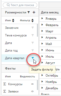 3. Нажмите кнопку Применить. Фильтр будет задан, значок фильтра у размерности станет синего цвета.