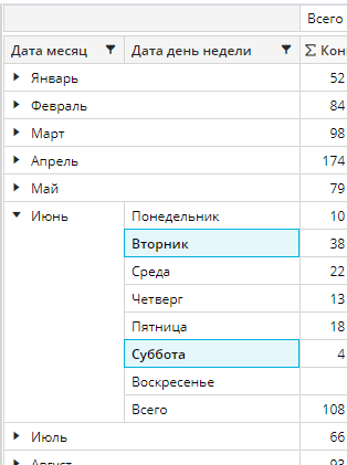 Если применить опцию к любому элементу размерности Дата день недели на рисунке Результат опции «Снять выделение» для элемента размерности «Август», то все дни кроме Вторника и Субботы будут скрыты, т. е. отфильтрованы:
