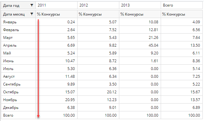 Для каждого элемента размерности Дата год определяются значения процента по каждому месяцу, которые в сумме дают 100%.Расчет факта Конкурсы по горизонтали в виде Процент.