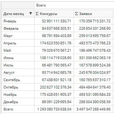 - Сортировать по убыванию/возрастанию – сортировка выполняется по столбцу того факта, к которому была применена опция. Столбец факта окрашивается в светло-голубой цвет, а опция в контекстном меню будет отмечена флагом. На рисунке «Сортировка выполнена» данные отсортированы по итоговому значению факта Конкурсы по возрастанию и убыванию соответственно: