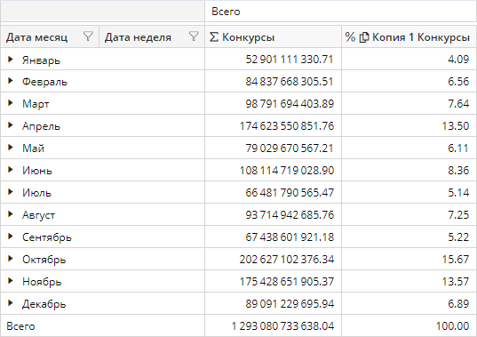 Рассмотрим пример, когда есть вложенные размерности. Если раскрыть элемент родительской размерности, то значение Всего факта Копия 1 Конкурсы вида Процент для вложенных элементов будет соответствовать значению данного факта для элемента родительской размерности Дата месяц, когда он был свернут. Так, на рисунке ниже, Всего для всех недель января равно 4.09, что представляет собой процентную долю января от общей суммы за год, то есть от 1 293 080 733 638.04. Значения для каждой недели января показаны от суммы конкурсов за январь, то есть от 52 901 111 330.71: