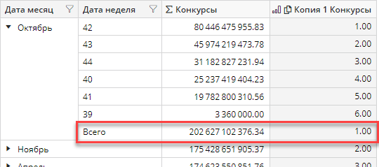 Рассмотрим пример, когда есть вложенные размерности. Если раскрыть элемент родительской размерности, то значение Всего факта Копия 1 Конкурсы вида Ранг для вложенных элементов будет соответствовать рангу раскрытого элемента родительской размерности Дата месяц в сравнении с другими месяцами. Так, на рисунке ниже, если раскрыть элемент Октябрь, то значение Всего будет равно 1.00, так как Октябрь имеет ранг 1 по всей мультисфере, а вот каждая неделя октября уже имеет свой рейтинг в рамках октября, то есть от 1 до 6 — это рейтинг недель в рамках месяца: