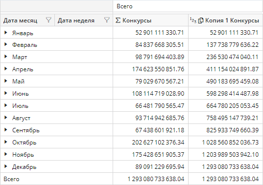 Рассмотрим пример. Требуется рассчитать нарастающий итог по каждому месяцу за год. Для этого создадим копию факта Конкурсы и изменим для нее вид факта на Нарастающее. Как видно из рисунка ниже, значение нарастающего итога для первого элемента, Январь, равно исходному значению, 52 901 111 330.71, далее идет приращение от месяца к месяцу, и значение нарастающего итога для последнего элемента в выборке, Декабрь, равно исходному значению Всего за весь год, 1 293 080 733 638.04. При этом значение Всего для второго столбца также равно этой сумме: