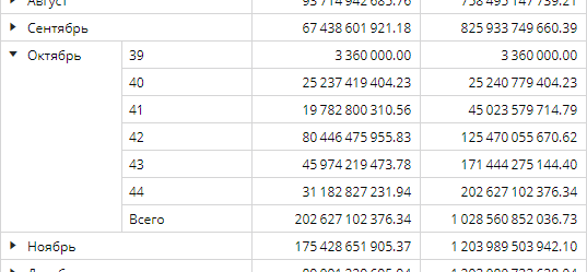 Рассмотрим пример, когда есть вложенные размерности. Если раскрыть элемент родительской размерности, то значение Всего факта Копия 1 Конкурсы вида Нарастающее для вложенных элементов будет соответствовать значению данного факта для элемента родительской размерности, когда он был свернут. Так, на рисунке Всего для всех недель октября рассчитывается следующим образом: 825 933 749 660.39 + 202 627 102 376.73 = 1 028 560 852 036.73. Элементам вложенной размерности Дата неделя соответствуют значения нарастающего итога за каждую неделю октября, от 3 360 000.00 до 202 627 102 376.73. При этом значение нарастающего для первой недели равно исходному значению для первой недели, 3 360 000.00, а значение нарастающего для последней недели в выборке равно значению Всего факта Конкурсы вида Значение, соответствующее сумме за все недели октября, 202 627 102 376.73: