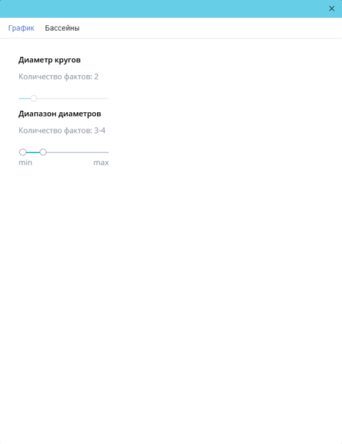 Особенностью графика Бассейны является то, что он умеет работать с кластеризацией. Для вывода на график результатов кластеризации необходимо расположить размерность Кластеризация первой слева и запустить модуль графики. Каждый элемент размерности, следующий за размерностью Кластеризация, будет отображен на графике в виде круга. Круги будут объединены в «бассейны» в зависимости от того, в каком кластере они находятся.
