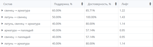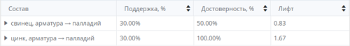 Если заказчик покупает свинец и арматуру, то с достоверностью в 50% он покупает еще и палладий, при этом данная тройка объектов встречается уже только у 30% заказчиков: