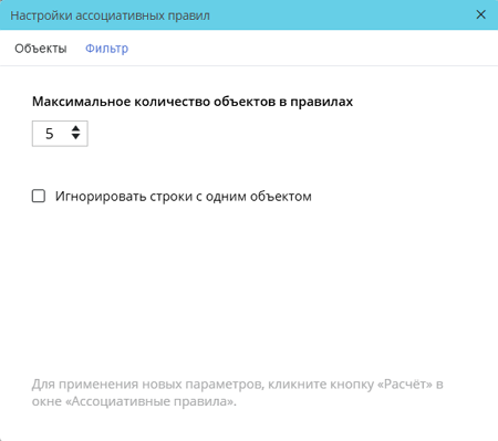 Окно настройки ассоциативных правил. Вкладка «Фильтр»