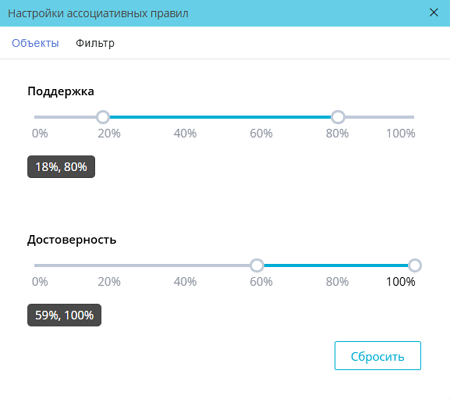 • Фильтр. На данной вкладке можно с помощью ползунков указать необходимый диапазон фильтрации по поддержке и достоверности. Кнопка Сбросить отменяет все изменения настроек фильтрации:
