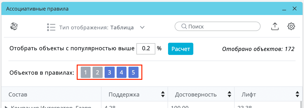 Для удобства работы с ассоциативными правилами Polymatica Analytics содержит различные инструменты для их поиска, фильтрации и настройки: