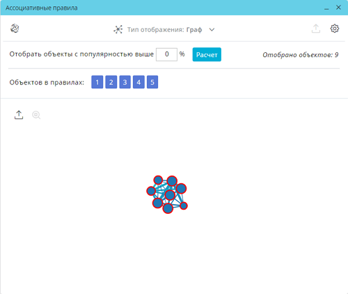 - Ребра – связи между объектами. Достоверность правила обозначается градиентом цвета связи в зависимости от значения достоверности.