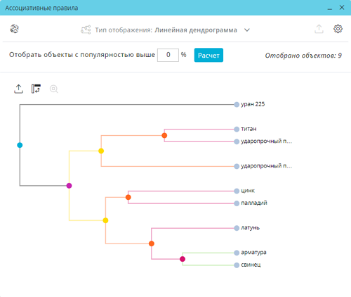 По нажатию левой кнопкой мыши на цветной узел дендрограммы все дочерние ветви и расположенные на них узлы скрываются из области построения. При этом центр узла, ниже которого есть скрытые объекты, окрашивается в белый, а цветным остается только контур узла. Чтобы снова отобразить объекты на дочерних ветвях, нужно повторно нажать на узел. На рисунке ниже показан пример линейной дендрограммы со всеми узлами и со скрытым узлом «арматура–свинец»: