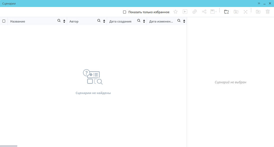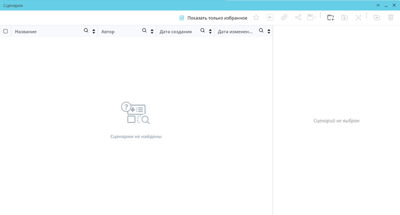 При отсутствии сценариев и папок, доступных пользователю, или при отсутствии результатов, удовлетворяющих запросу в поле поиска, а также если чекбокс «Показать только избранное» отмечен, а избранных сценариев у пользователя нет, в окне «Сценарии» отображается сообщение «Сценарии не найдены»: