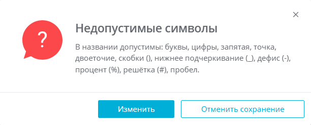 В названии сценария допустимы буквы, цифры, запятая, точка, двоеточие, круглые скобки, нижнее подчеркивание, дефис, знак процента, решетка и пробел. При попытке сохранить сценарий, имя которого содержит недопустимые символы, появляется окно с ошибкой: