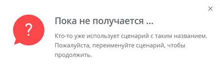 В системе допустимо наличие сценариев с одинаковым названием, при условии, что они лежат в разных папках. Однако поделиться сценарием можно, только если его название будет уникальным в пределах системы. При попытке поделиться сценарием с неуникальным названием отображается следующее сообщение: