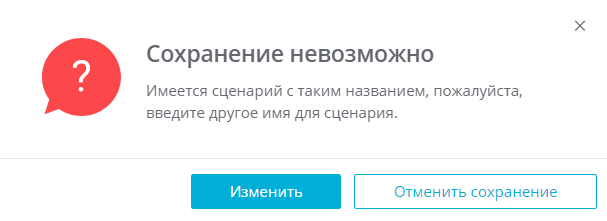 Нажатие на «Сохранить как» позволит сохранить измененный сценарий как копию с автоматическим добавлением префикса «Новый сценарий» в название. При этом изменения, внесенные во второй сценарий, будут сброшены, а изменения, внесенные в исходный сценарий, не будут ни сохранены, ни сброшены. Поэтому в случае попытки изменить какой-то другой сценарий, пользователь снова увидит соответствующее окно с предупреждением.