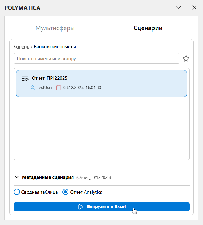 Если в сценарии не содержится таблиц, созданных на основе доступных пользователю мультисфер, то для такого сценария кнопка «Выгрузить в Excel» неактивна. В таком случае нужно обратиться к администратору для восстановления удаленных мультисфер или настройки прав доступа пользователя к мультисферам.