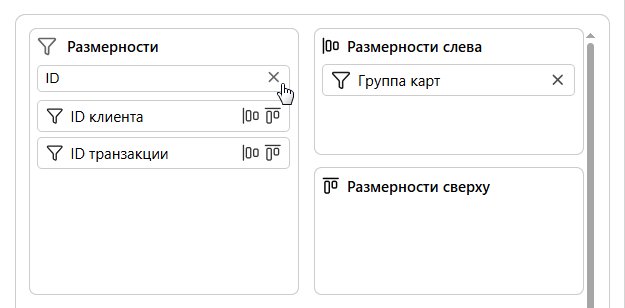 Чтобы вернуть размерность из блока «Размерности слева» или «Размерности сверху» обратно в блок «Размерности», можно перетащить ее туда или нажать на кнопку справа от ее названия: